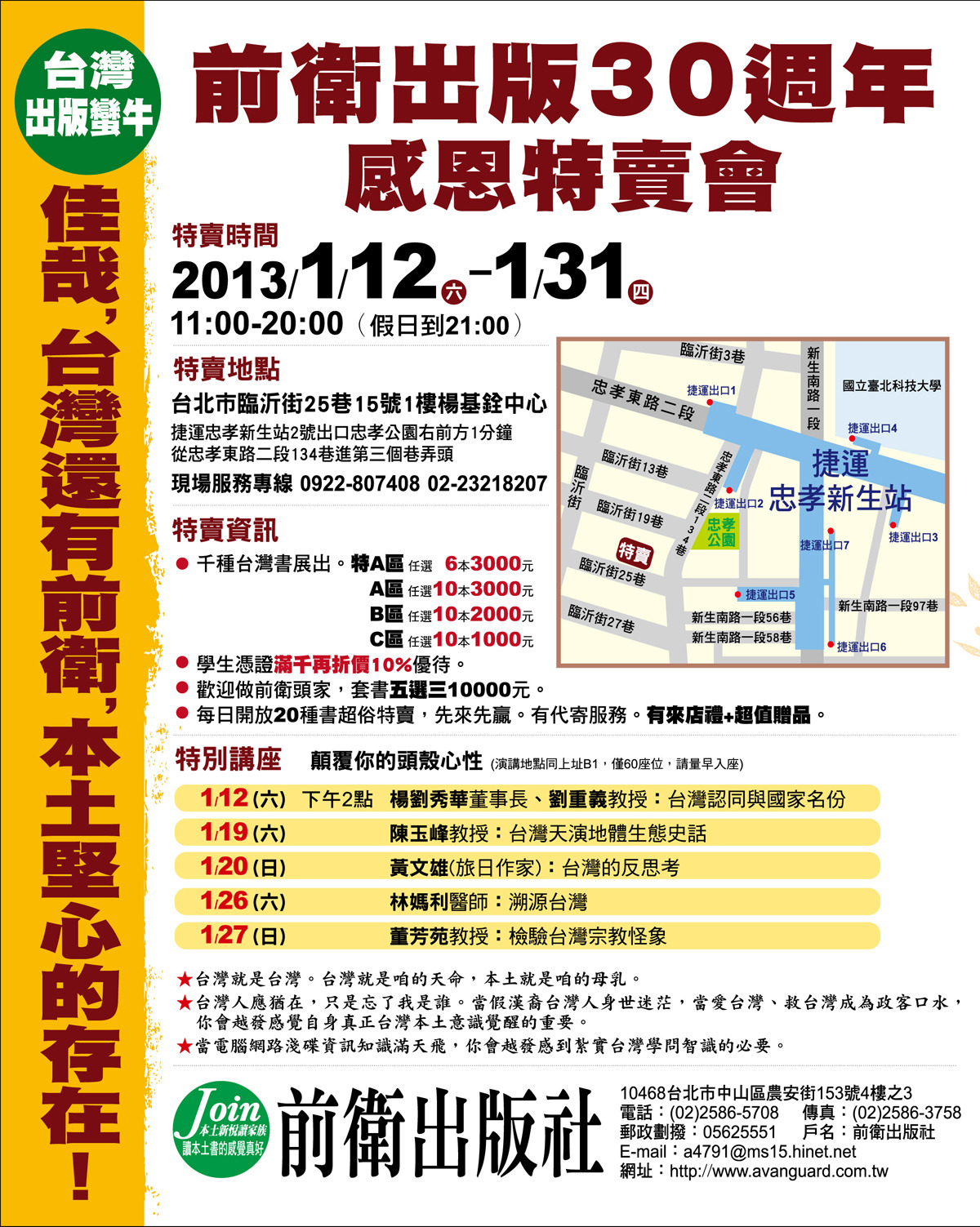 本土堅心的存在! 前衛出版30週年感恩特賣會 特賣時間→2013.1/12~1/31 11:00~20:00 特賣地點→台北市臨沂街25巷15號1樓楊基銓中心 捷運忠孝新生站2號出口忠孝公園右前方1分鐘 從忠孝東路二段134巷進第三個巷弄頭 現場服務專線 0922-807408 02-23218207 特賣資訊→●千種台灣書展出。特A區任選6本3000元, A區任選10本3000元, B區任選10本2000元, C區任選10本1000元。 ●學生憑證滿千再折價10%優待。 ●歡迎做前衛頭家,頭家特惠:前衛經典套書五選三10000元。 ●每日開放20種書超俗特賣,先來先贏。