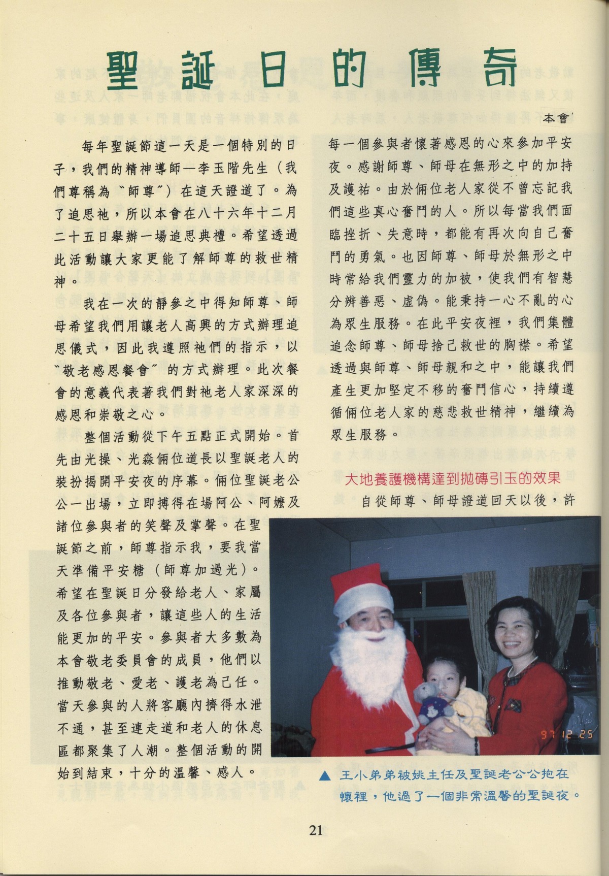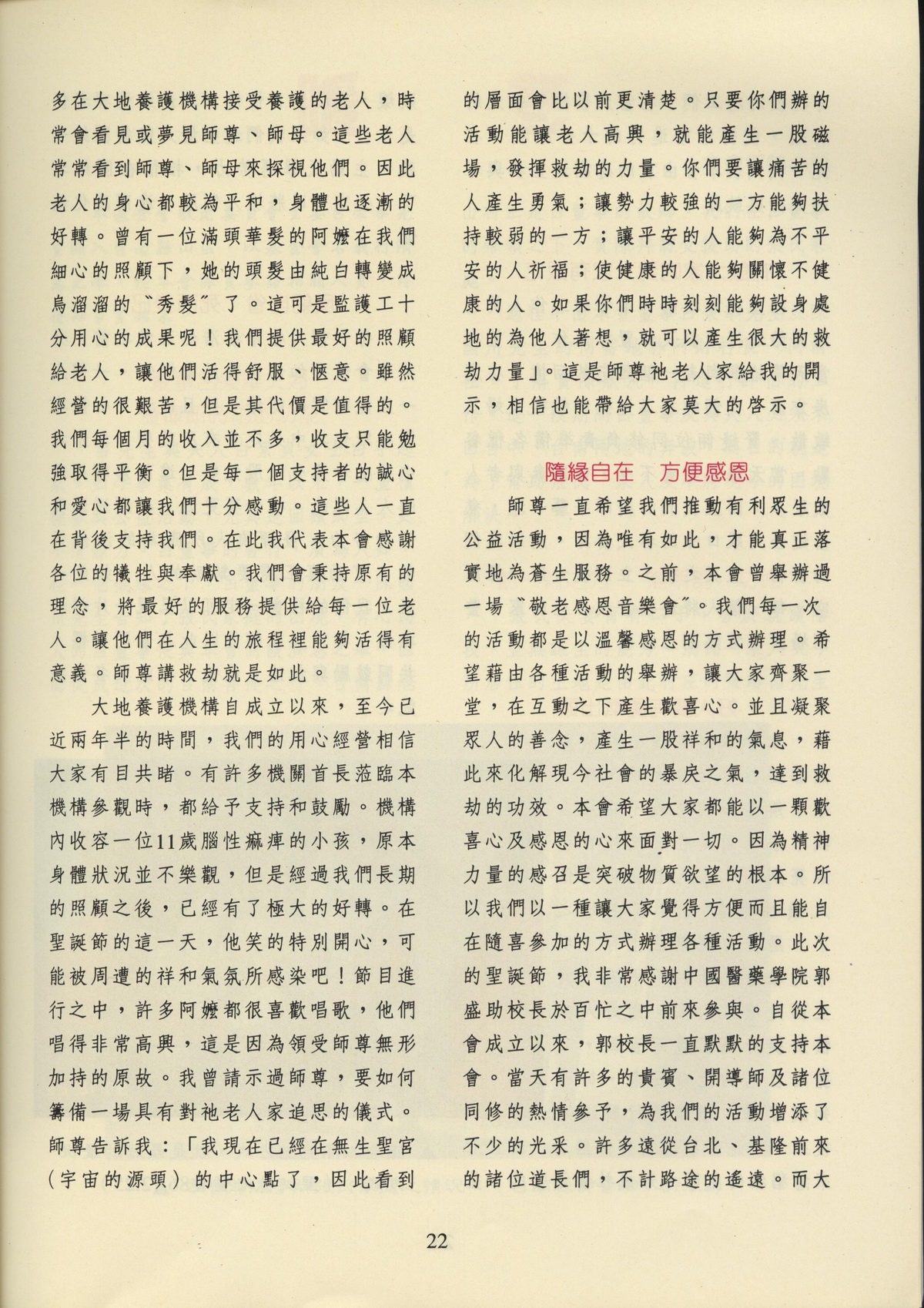 大地養護機構自成立以來,至今已近兩年半的時間,我們的用心經營相信大家有目共睹。有許多機關首長蒞臨本機構參觀時,都給予支持和鼓勵。機構內收容一位十二歲腦性痲痺的小孩,原本身體狀況並不樂觀,但是經過我們長期的照顧之後,已經有了極大的好轉。在聖誕節的這一天,他笑的特別開心,可能被周遭的祥和氣氛所感染吧!節目進行之中,許多阿嬤都很喜歡唱歌,他們唱得非常高興,這是因為領受師尊無形加持的原故。我曾請示過師尊,要如何籌備一場具有對祂老人家追思的儀式。師尊告訴我:「我現在已經在無生聖宮(宇宙的源頭)的中心點了,因此看到的層面會比以前更清楚。只要你們辦的活動能讓老人高興,就能產生一股磁場,發揮救劫的力量。你們要讓痛苦的人產生勇氣;讓勢力較強的一方能夠扶持較弱的一方;讓平安的人能夠為不平安的人祈福;使健康的人能夠關懷不健康的人。如果你們時時刻刻能夠設身處地的為他人著想,就可以產生很大的救劫力量」。這是師尊祂老人家給我的開示,相信也能帶給大家莫大的啟示。