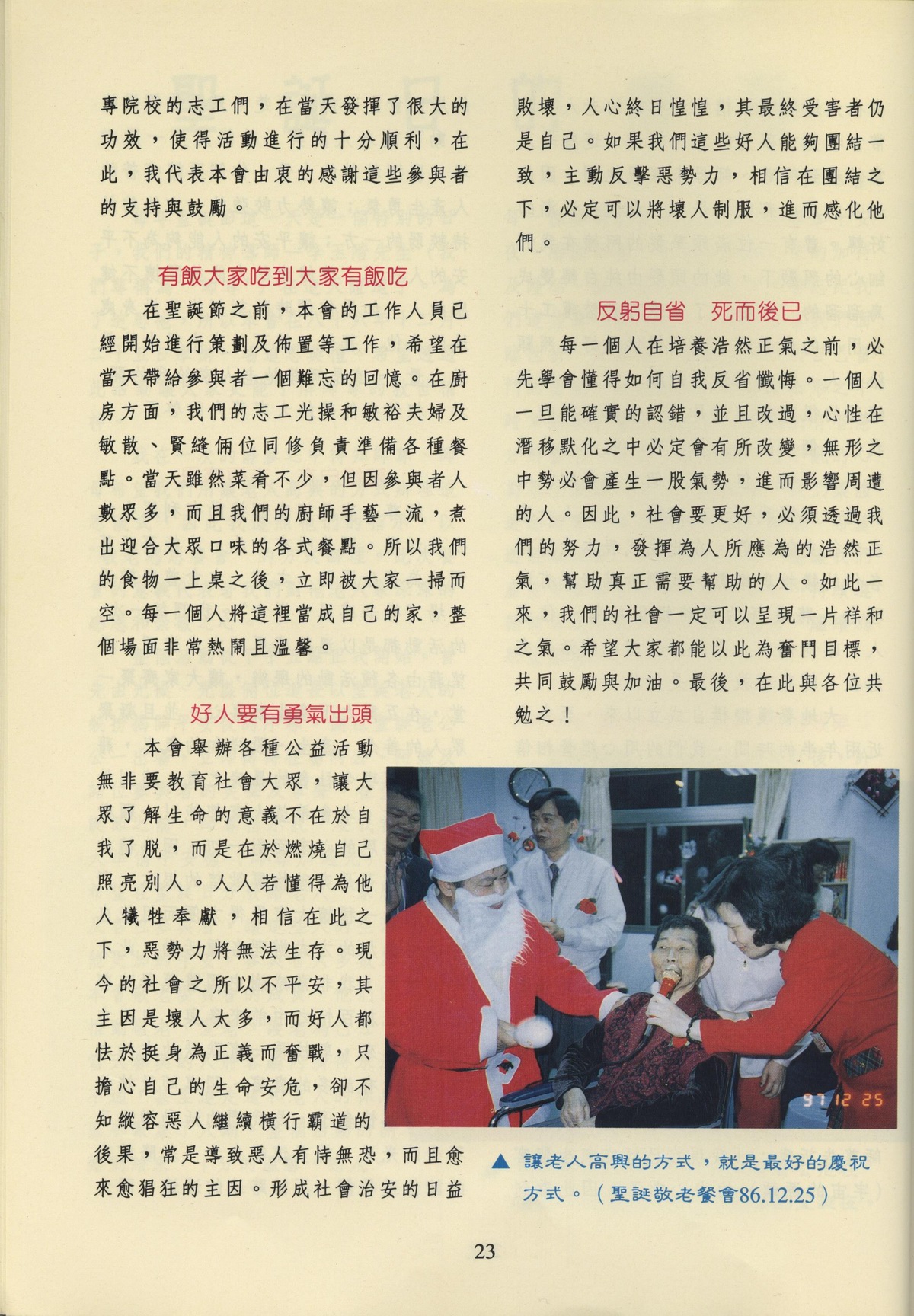 師尊一直希望我們推動有利眾生的公益活動,因為唯有如此,才能真正落實地為蒼生服務。之前,本會曾舉辦過一場〝敬老感恩音樂會〞。我們每一次的活動都是以溫馨感恩的方式辦理。希望藉由各種活動的舉辦,讓大家齊聚一堂,在互動之下產生歡喜心。並且凝聚眾人的善念,產生一股祥和的氣息,藉此來化解現今社會的暴戾之氣,達到救劫的功效。本會希望大家都能以一顆歡喜心及感恩的心來面對一切。因為精神力量的感召是突破物質欲望的根本。所以我們以一種讓大家覺得方便而且能自在隨喜參加的方式辦理各種活動。此次的聖誕節,我非常感謝中國醫藥學院郭盛助校長於百忙之中前來參與。自從本會成立以來,郭校長一直默默的支持本會。當天有許多的貴賓、開導師及諸位同修的熱情參予,為我們的活動增添了不少的光釆。許多遠從台北、基隆前來的諸位道長們,不計路途的遙遠。而大專院校的志工們,在當天發揮了很大的功效,使得活動進行的十分順利,在此,我代表本會由衷的感謝這些參與者的支持與鼓勵。
