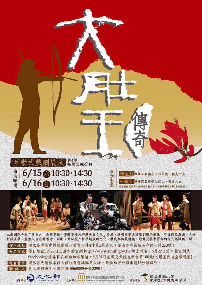 一、緣起: 為增進學生對國立臺灣歷史博物館當期特展「看見平埔—臺灣平埔族群歷史與文化」的興趣,本館特導入互動式戲劇展演【大肚王傳奇】,透過情境式觀眾參與模式,讓參與者在高潮迭起的戲劇中,移情於主要歷史人物中,思考在歷史事件中的掙扎與抉擇,同時建立平埔族群文化、傳統禮儀、歌舞及社會習俗的意識與覺知。 二、指導單位:文化部 主辦單位:國立臺灣歷史博物館 演出單位:國立臺南大學戲劇創作與應用學系 三、演出時間:2013/6/15(六)10:30-12:00、14:30-16:00 2013/6/16(日)10:30-12:00、14:30-16:00 共計4場,每場演出90分鐘。 演出地點:國立臺灣歷史博物館展示教育大樓4樓第1特展室(臺南市安南區長和路一段250號) 四、劇目簡介: 17世紀的臺灣中部,有一個跨15至20個平埔部落的領袖大肚王,臂力驚人,神射千里,受到部落的敬重與推崇,但臺灣島越來越多不同族群來作生意、生活和開發,遠渡而來的荷蘭人想經過大肚王的領地,打通南北部做更大的生意,派兵攻打部落,大肚王部落初雖以地利之便獲勝,但最終仍不敵荷人的現代武器,只好選擇與荷人和談,以減少部落的傷亡和損失。而第二代大肚王對不斷侵入部落的各種外力所造成的生活與文化衝擊與改變,感到憂心和不滿,而心存反抗,面對自唐山湧來的漢人,正計畫著一場驚天動地的抗戰,掀起了部落更大的近乎滅族劫難。 本劇主要在敍述大肚部落兩代大肚王為捍衛族人尊嚴與文化的勇氣和智慧,如何分別選擇以和平與戰爭的方式來面對荷蘭人、漢人等外來勢力群強環伺的衝擊,面對不同族群與文化如何做抉擇。 五、參加對象:學生組(國小五六年級、國高中生)每場30名。 一般組(高中生以上、社會人士)每場70名。 ※活動全程參與之教師或公務人員,將核發研習時數2小時證明,請於當日演出結束後至演出服務處登記,逾期恕不補登。 六、報名方式:即日起至5月22日止至本館官網線上報名 七、名單公布:2013年5月27日於本館官網及facebook粉絲專頁公布參加名單。參加者須於5月31日前完成保證金新台幣100元繳費,並回信至theater@nmth.gov.tw或傳真至06-3564981註明參加者姓名、匯款人姓名、匯款日期、轉帳帳號後五碼。若逾期未完成繳費,將列入候補名單。(若仍想參加,必須來電查詢是否還有名額。) 八、報名費用:演出當天,參加者仍須依本館入館收費標準購票入場,並於演出前15分鐘報到,以利準時開演。入場簽到後,退還全額保證金,未簽到者保證金繳入國庫,不得異議。 九、保證金繳納方式:採ATM轉帳或匯款方式(手續費自付,可多人合併轉帳匯款),匯款帳戶:中央銀行國庫局(代碼000-0022),帳號:246-101-021-200-23 戶名:國立臺灣歷史博物館 十、其他事項:若發生不可抗力之因素影響活動進行(例如:風災、地震、火災等),依規定辦理延期並立即公告。本活動相關資訊均公告於本館官網,為求最佳活動品質及效益,本館將保留修改之權力。 十一、聯絡人:國立臺灣歷史博物館展示組郭先生。電話:06-3568889分機2298。 我要報名