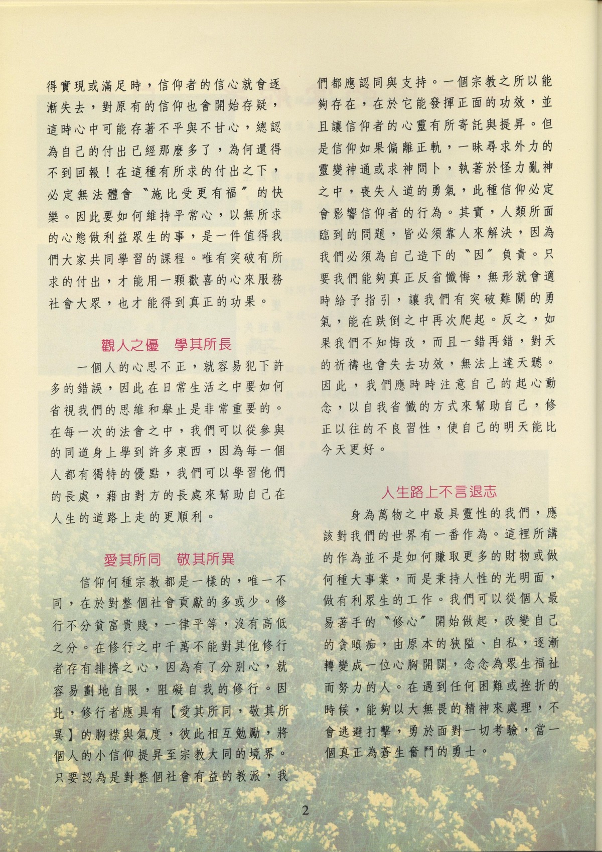 信仰何種宗教都是一樣的,唯一不同,在於對整個社會貢獻的多或少。修行不分貧富貴賤,一律平等,沒有高低之分。在修行之中千萬不能對其他修行者存有排擠之心,因為有了分別心,就容易劃地自限,阻礙自我的修行。因此,修行者應具有【愛其所同,敬其所異】的胸襟與氣度,彼此相互勉勵,將個人的小信仰提昇至宗教大同的境界。只要認為是對整個社會有益的教派,我們都應認同與支持。一個宗教之所以能夠存在,在於它能發揮正面的功效,並且讓信仰者的心靈有所寄託與提昇。但是信仰如果偏離正軌,一昧尋求外力的靈變神通或求神問卜,執著於怪力亂神之中,喪失人道的勇氣,此種信仰必定會影響信仰者的行為。其實,人類所面臨到的問題,皆必須靠人來解決,因為我們必須為自己造下的〝因〞負責。只要我們能夠真正反省懺悔,無形就會適時給予指引,讓我們有突破難關的勇氣,能在跌倒之中再次爬起。反之,如果我們不知悔改,而且一錯再錯,對天的祈禱也會失去功效,無法上達天聽。因此,我們應時時注意自己的起心動念,以自我省懺的方式來幫助自己,修正以往的不良習性,使自己的明天能比今天更好。