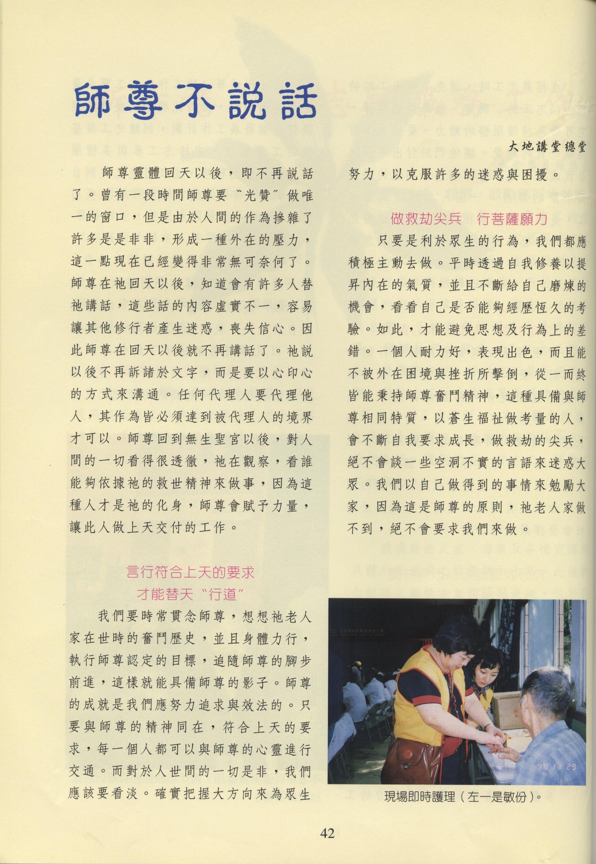 師尊靈體回天以後,即不再說話了。曾有一段時間師尊要〝光贊〞做唯一的窗口,但是由於人間的作為摻雜了許多是是非非,形成一種外在的壓力,這一點現在已經變得非常無可奈何了。師尊在祂回天以後,知道會有許多人替祂講話,這些話的內容虛實不一,容易讓其他修行者產生迷惑,喪失信心。因此師尊在回天以後就不再講話了。祂說以後不再訴諸於文字,而是要以心印心的方式來溝通。任何代理人要代理他人,其作為皆必須達到被代理人的境界才可以。師尊回到無生聖宮以後,對人間的一切看得很透徹,祂在觀察,看誰能夠依據祂的救世精神來做事,因為這種人才是祂的化身,師尊會付予力量,讓此人做上天交付的工作。