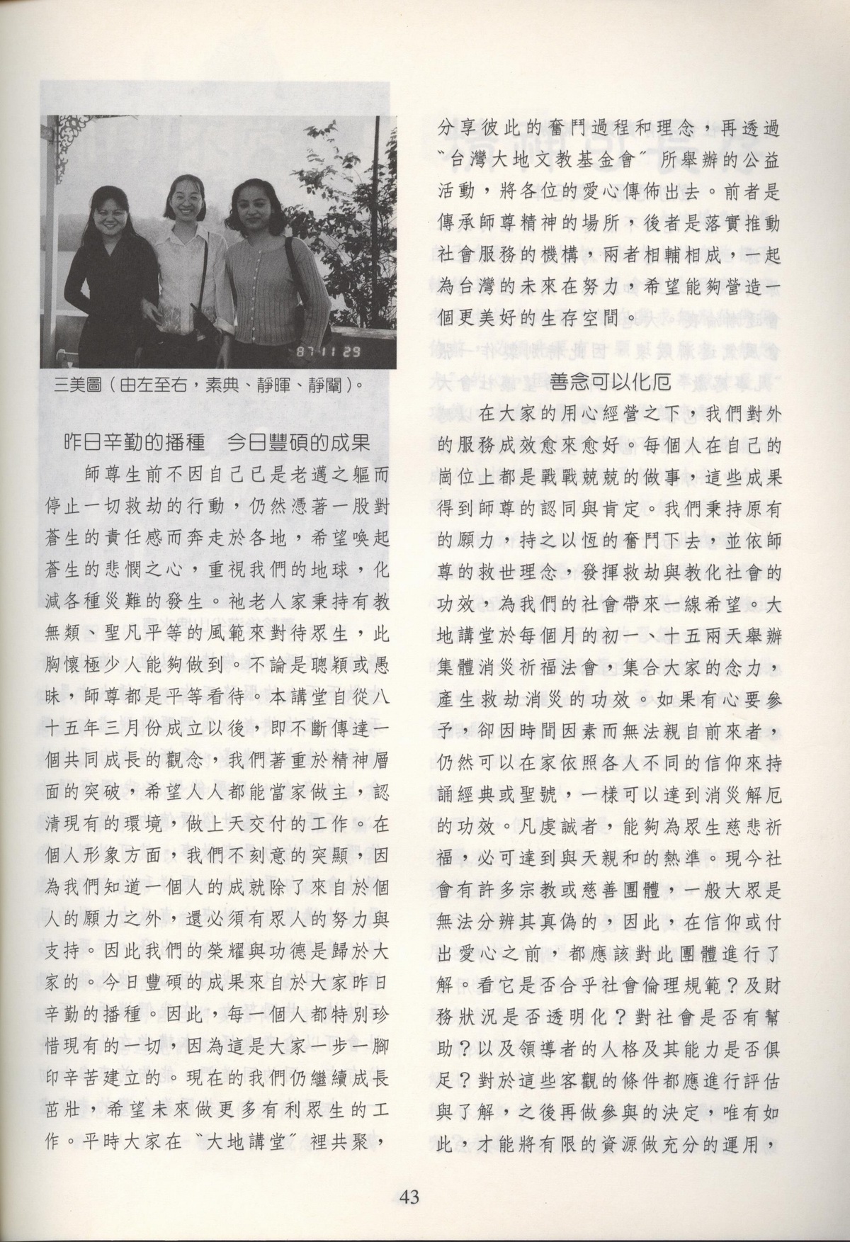 師尊生前不因自己已是老邁之軀而停止一切救劫的行動,仍然憑著一股對蒼生的責任感而奔走於各地,希望喚起蒼生的悲憫之心,重視我們的地球,化減各種災難的發生。祂老人家秉持有教無類、聖凡平等的風範來對待眾生,此胸懷極少人能夠做到。不論是聰穎或愚昧,師尊都是平等看待。本講堂自從八十五年一月份成立以後,即不斷傳達一個共同成長的觀念,我們著重於精神層面的突破,希望人人都能當家做主,認清現有的環境,做上天交付的工作。在個人形象方面,我們不刻意的突顯,因為我們知道一個人的成就除了來自於個人的願力之外,還必須有眾人的努力與支持。因此我們的榮耀與功德是歸於大家的。今日豐碩的成果來自於大家昨日辛勤的播種。因此,每一個人都特別珍惜現有的一切,因為這是大家一步一腳印辛苦建立的。現在的我們仍繼續成長茁壯,希望未來做更多有利眾生的工作。平時大家在〝大地講堂〞裡共聚,分享彼此的奮鬥過程和理念,再透過〝台灣大地文教基金會〞所舉辦的公益活動,將各位的愛心傳佈出去。前者是傳承師尊精神的場所,後者是落實推動社會服務的機構,兩者相輔相成,一起為台灣的未來在努力,希望能夠營造一個更美好的生存空間。