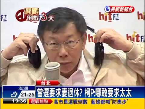 名嘴周玉蔻vs.台北市長候選人(無)柯文哲:「你有沒有去要求她為了你,如果選上要叫她退休,哪裡敢要求她做什麼事,拜託,你那麼怕太太喔?不是怕那叫尊重,她都53歲了值那個大夜班,一個晚上沒有睡覺,第二天都很虛,累死了,我沒有叫她辭,她自己都很想落跑了,但是妳不做就要去找另外一個工作,貼補家用,我房貸還沒有繳完耶。」