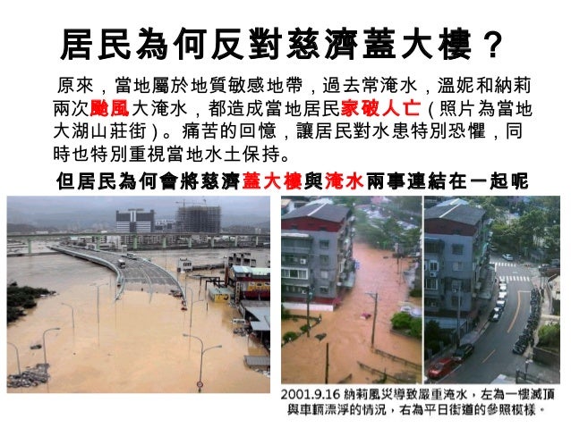 3. 居民為何反對慈濟蓋大樓?原來,當地屬於地質敏感地帶,過去常淹水,溫妮和納莉兩次颱風大淹水,都造成當地居民家破人亡 ( 照片為當地大湖山莊街 ) 。痛苦的回憶,讓居民對水患特別恐懼,同時也特別重視當地水土保持。但居民為何會將慈濟蓋大樓與淹水兩事連結在一起呢? 3