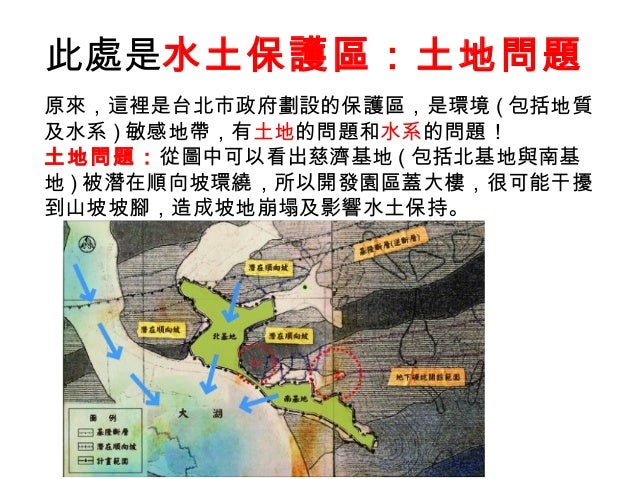 4. 此處是水土保護區:土地問題原來,這裡是台北市政府劃設的保護區,是環境 ( 包括地質及水系 ) 敏感地帶,有土地的問題和水系的問題!土地問題:從圖中可以看出慈濟基地 ( 包括北基地與南基地 ) 被潛在順向坡環繞,所以開發園區蓋大樓,很可能干擾到山坡坡腳,造成坡地崩塌及影響水土保持。 4