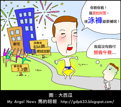 (2) 現在「633」變成笑話,全國就業者平均薪水倒退到十三年前水準,馬英九不但沒有把薪水捐出來,還在今年7月幫自己加薪3%,每個月多領1萬4千元。(2011.06.30聯合報「總統加薪13869元 月薪47萬6169」)